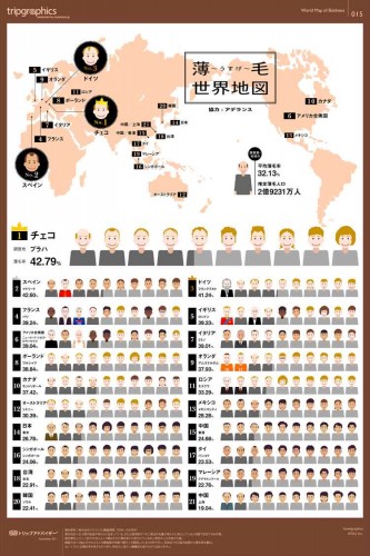 2015年10月20日 トリップアドバイザー発表による薄毛率をインフォグラフィックスにした「 それに、日本の薄毛率26. 78%は世界平均の32. 13%よりは低い 利用者満足度 ランキング【11】みんなが支持する旅にも必須の携帯電話会社は. 世界と比較すると日本人は薄毛・agaが多い? 日本のaga人口の割合を見る前に、少し世界の情報をお伝えしたいと思います。 大手企業「アデランス」が行った「世界の成人男性薄毛率」の調査より、トップ3には日本は入っていませんでした。 1位:チェコ. 日本人よ、ハゲたくなければストレス解消を! 世界のハゲランキング. 調べてい たら面白いものを発見しました!.